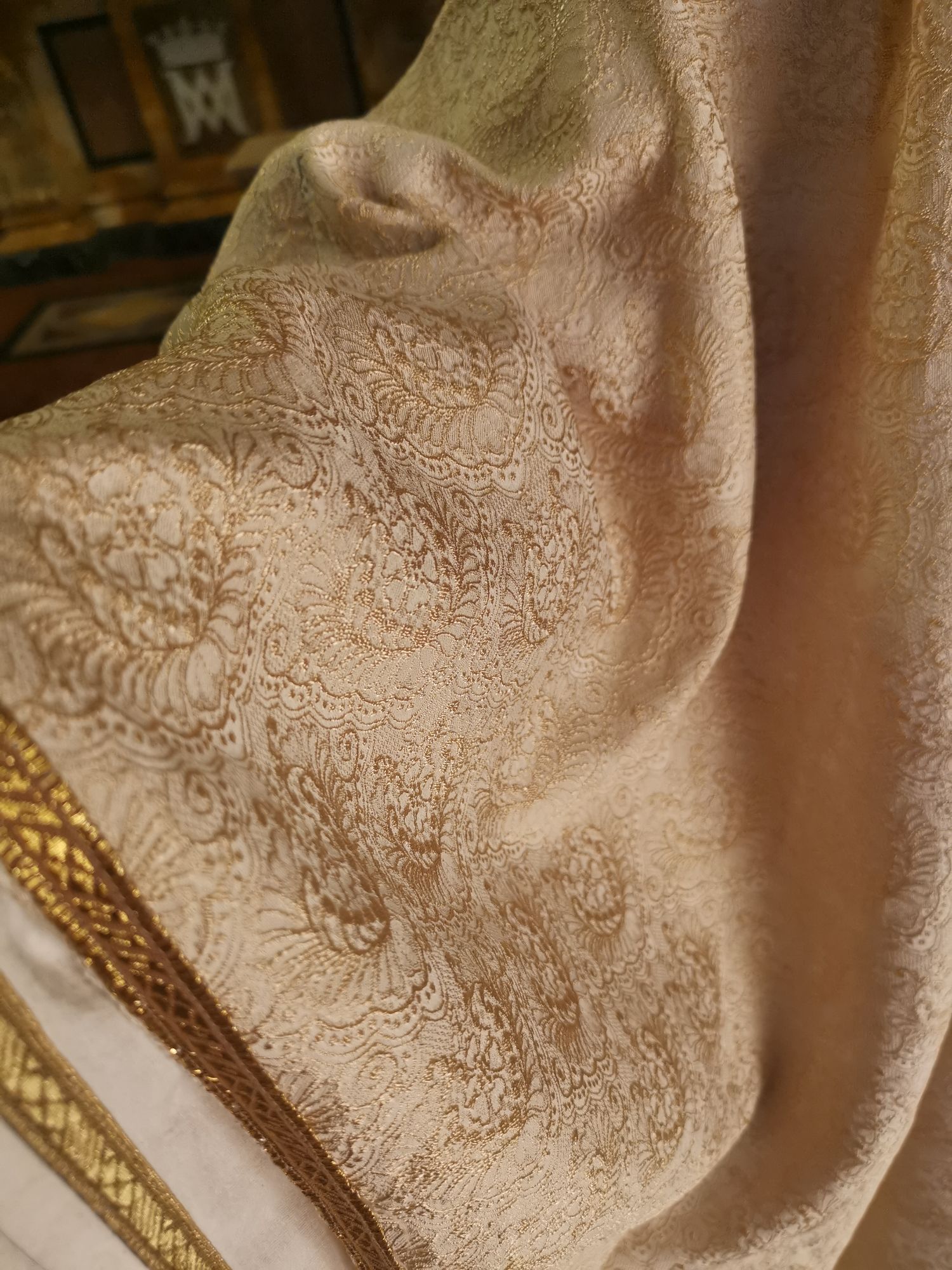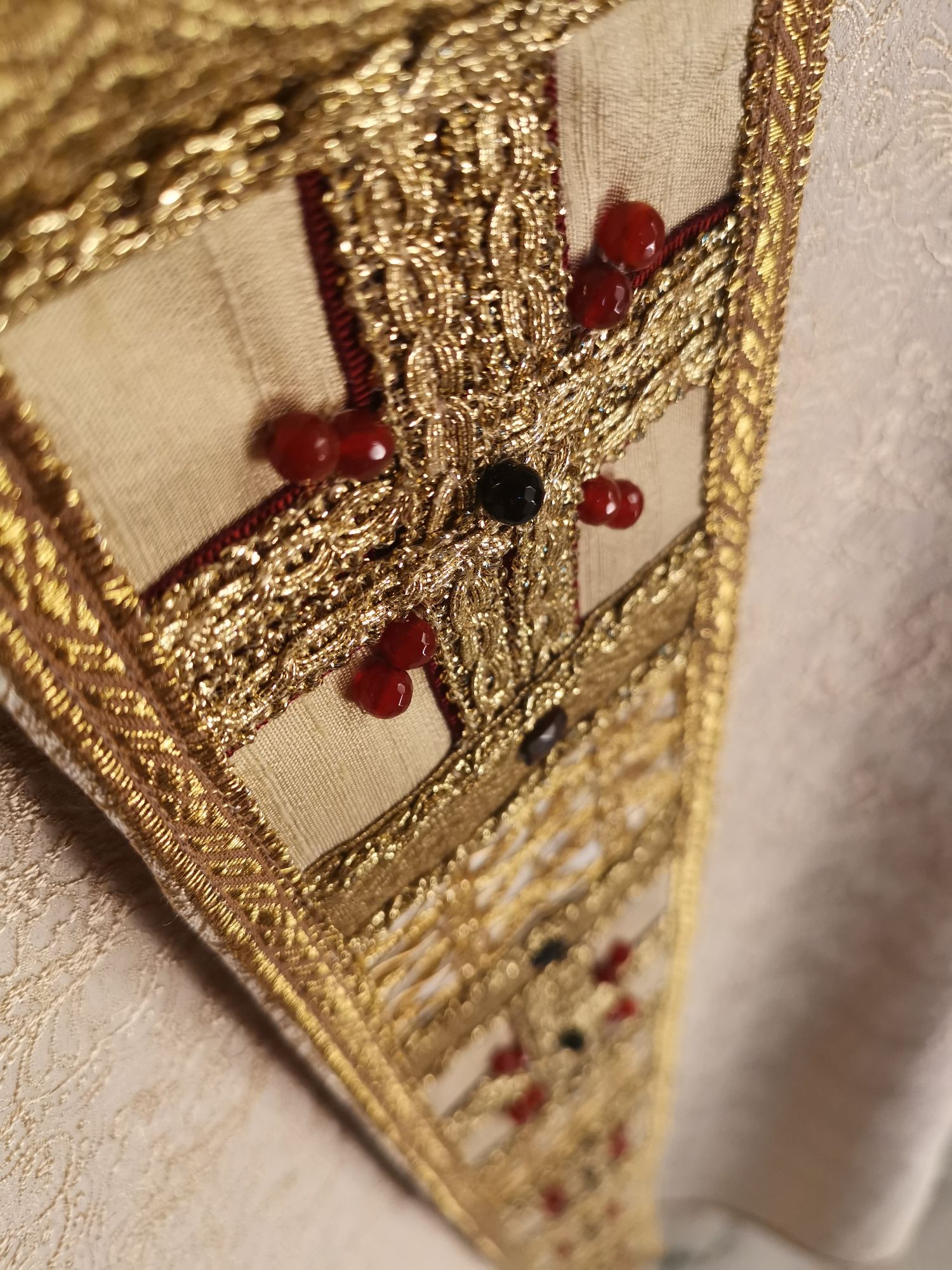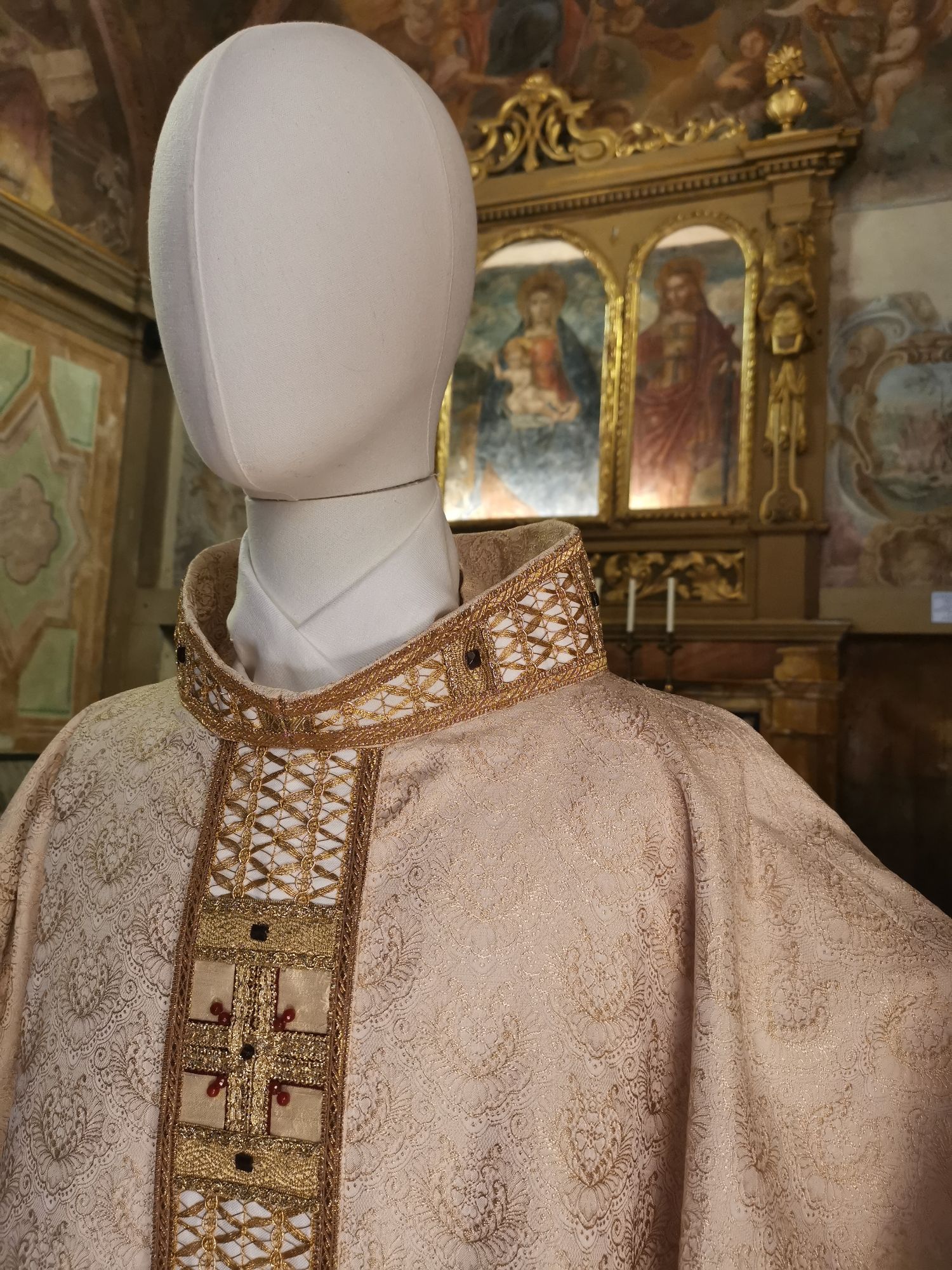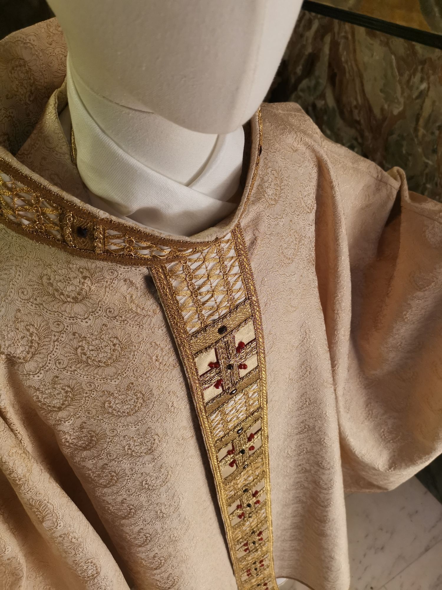 Casula in tessuto jacquard misto Cotone 60%, Acetato 39%, Lurex 1%, peso medio. Collo, aurifregi e ornamento della stola in shantung dorato e cotone, sei agrimani. Gemmatura con 148 sfere sfaccettate 6mm. di cornalina, 14 sfere sfaccettate 6 mm. di quarzo marrone, 30 quarzi marroni rettangolari.