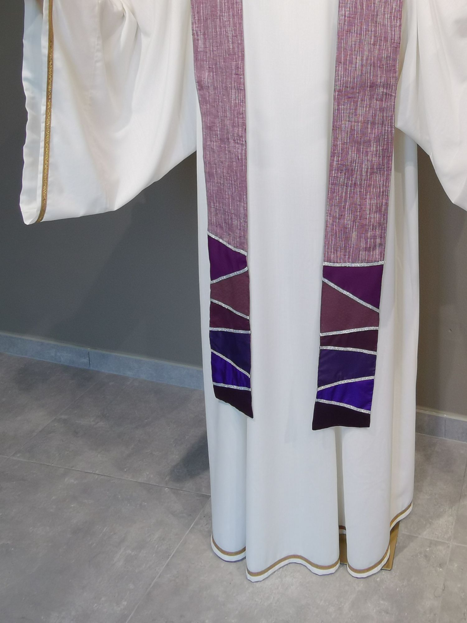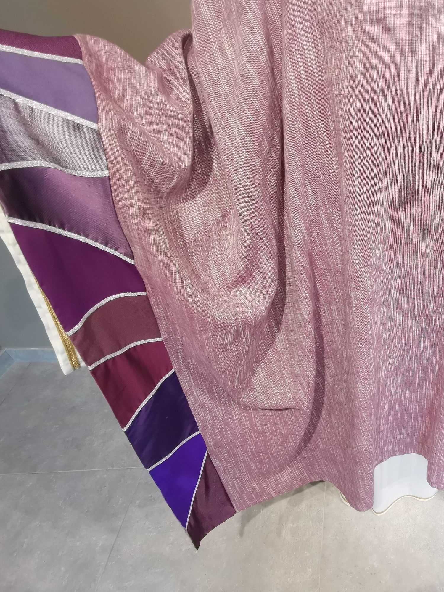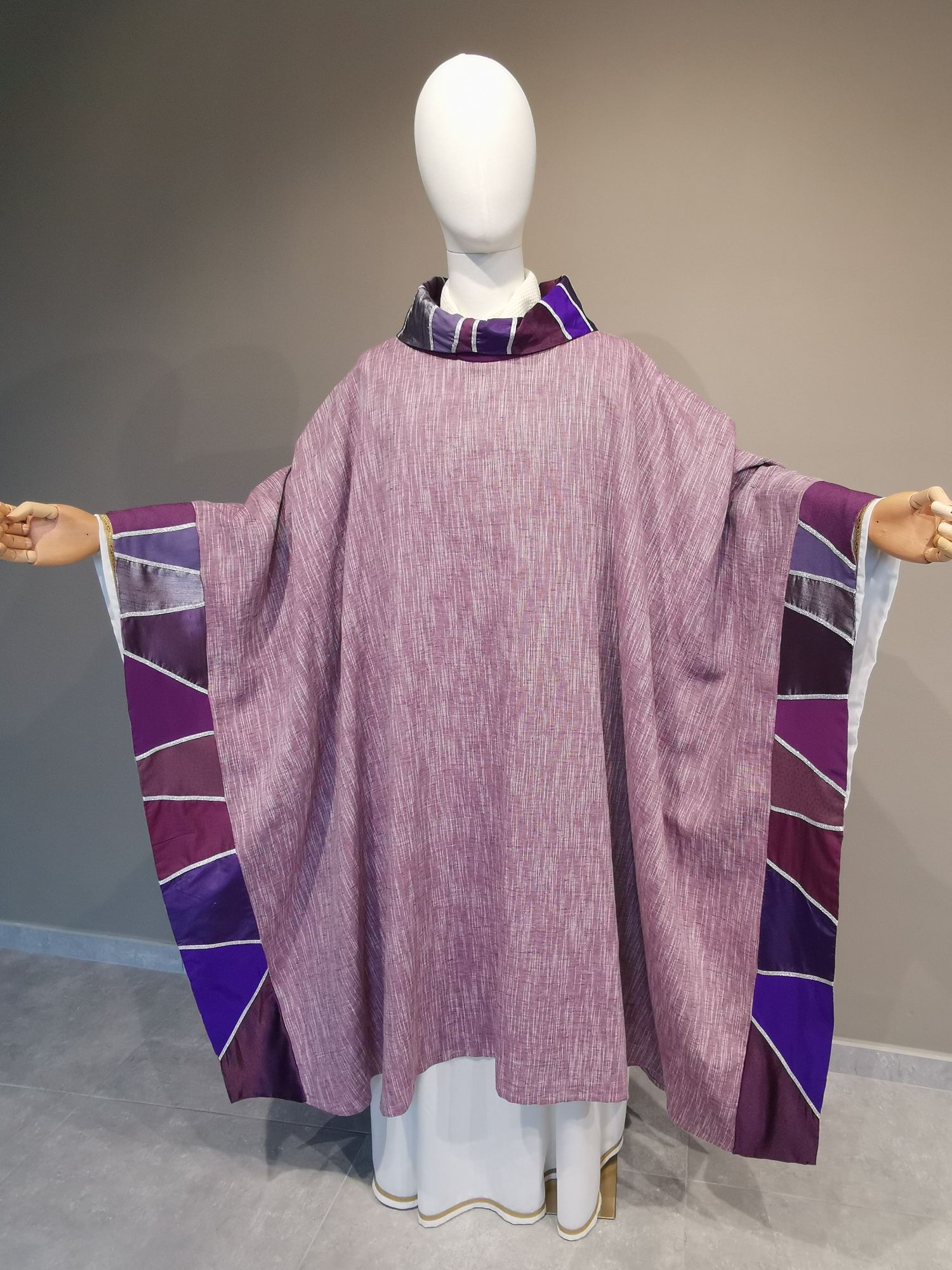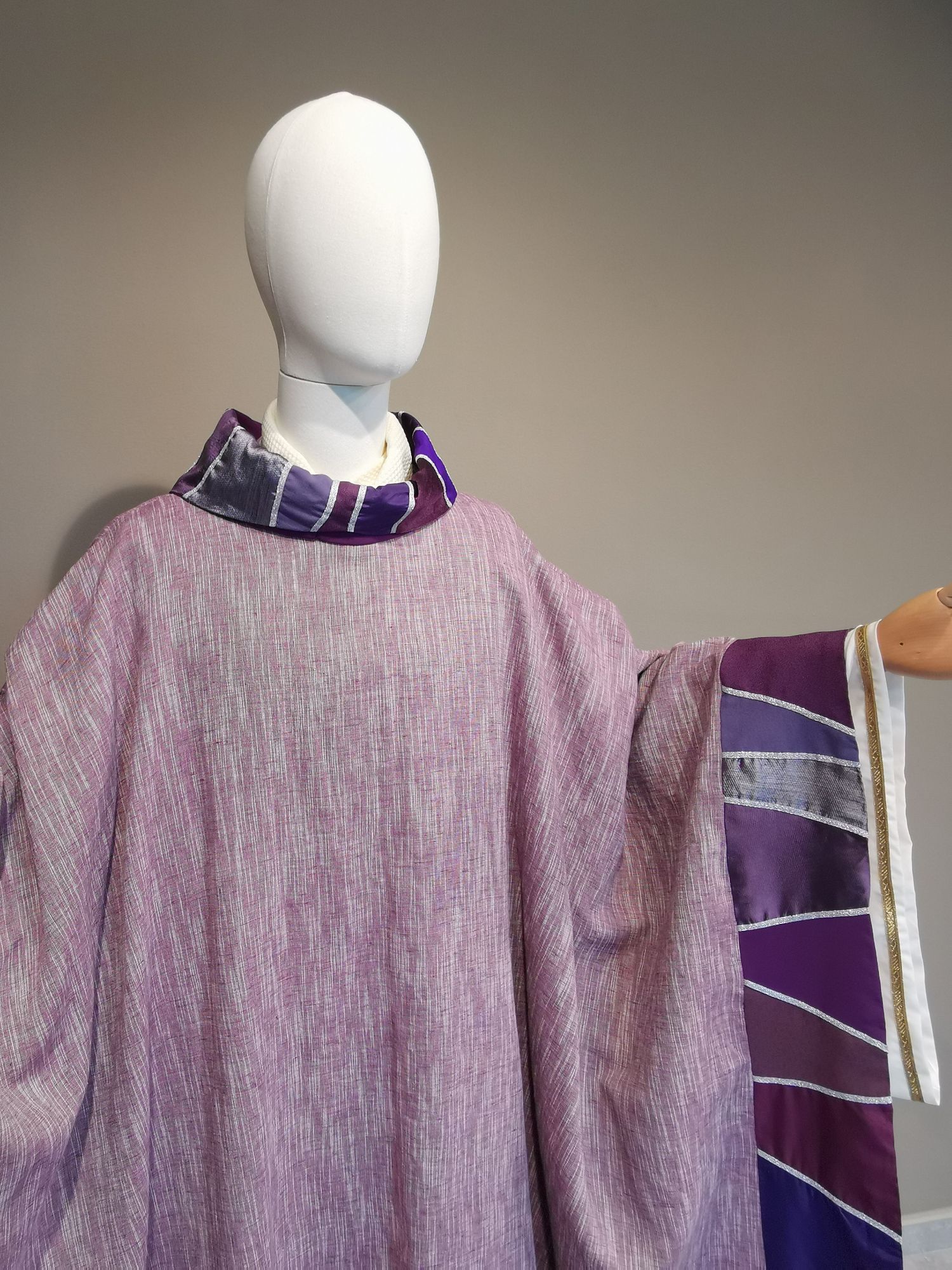 Casula in tessuto melange misto Cotone e Lino. Bordi, collo e ornamento della stola in tessuti vari nelle tonalità del viola.
